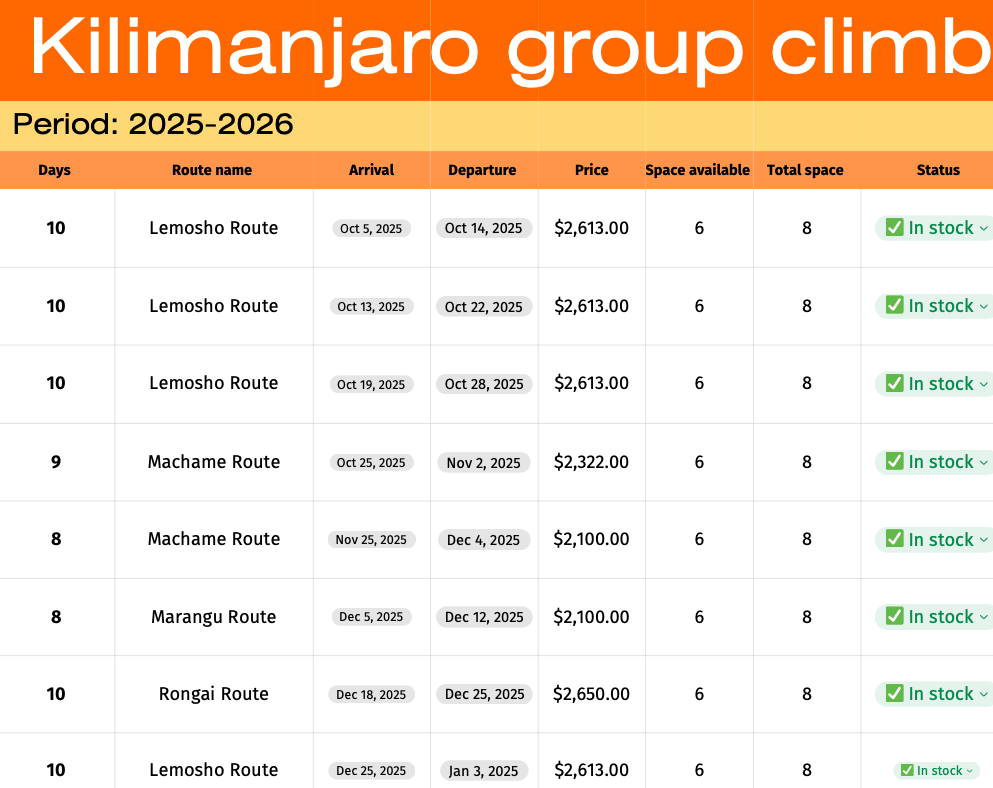 Machame 7 day Sept 28- Oct 6 2322 USD/person